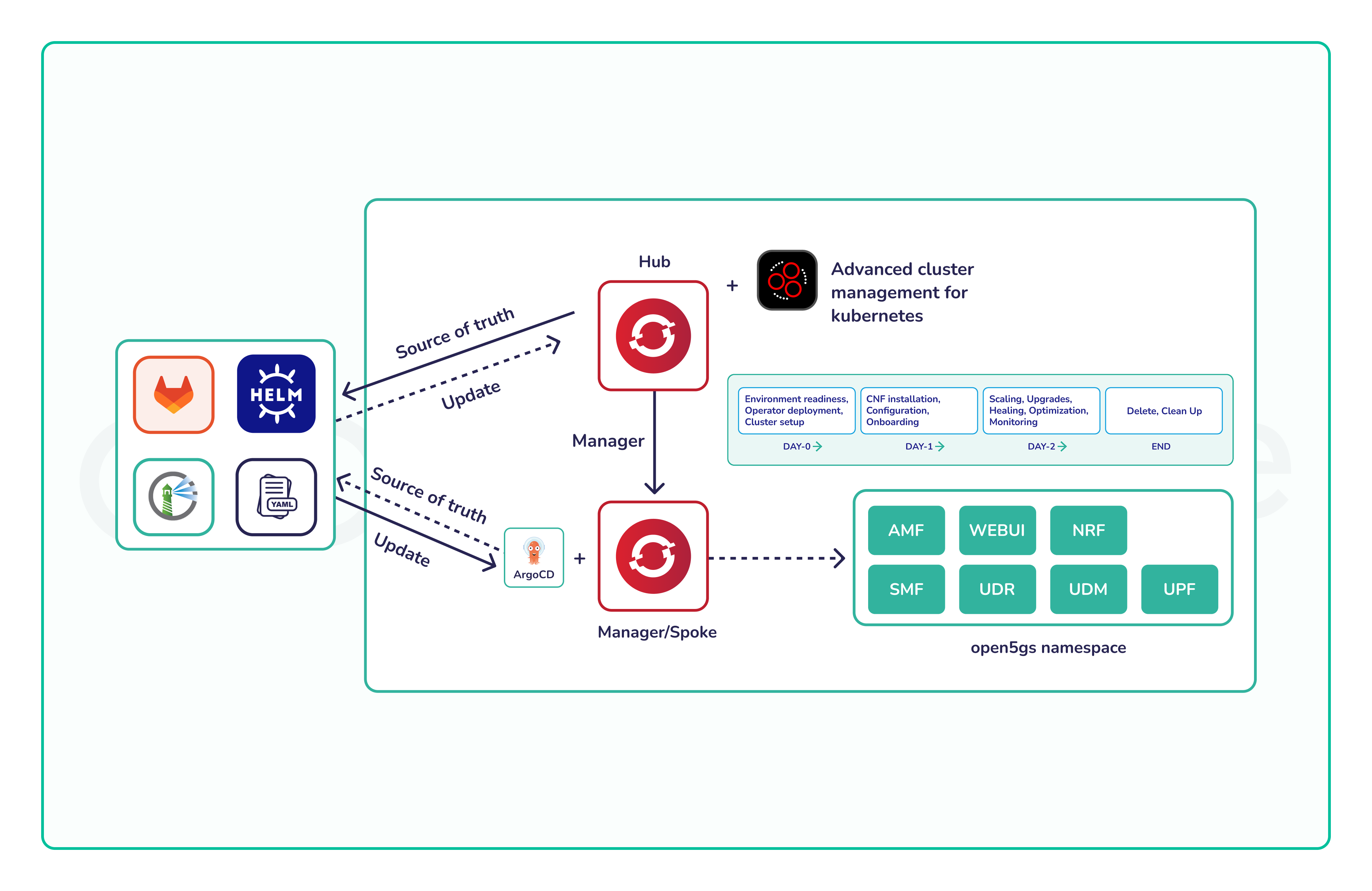 This Hand-On Training provides an environment for managing the full lifecycle of Cloud-Native Network Functions (CNFs) on OpenShift, using GitLab as the source of truth and ACM/Argo CD for automated delivery. It supports orchestration, deployment, upgrades, and operation of Telco CNFs such as Open5GS across hub-and-spoke clusters, enabling comparison with standard Kubernetes workflows.